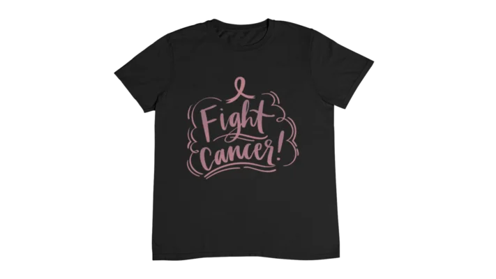 Design a breast cancer awareness T-shirt using pink as the main color and featuring the pink ribbon as a central symbol. Incorporate inspirational phrases like “Fight Like a Girl” or “Hope, Strength, Cure” for added impact.